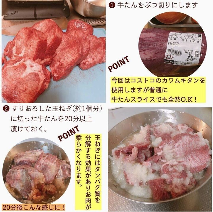 (2)すりおろした玉ねぎ(約1個分)に切った牛たんを20分以上漬けておく。