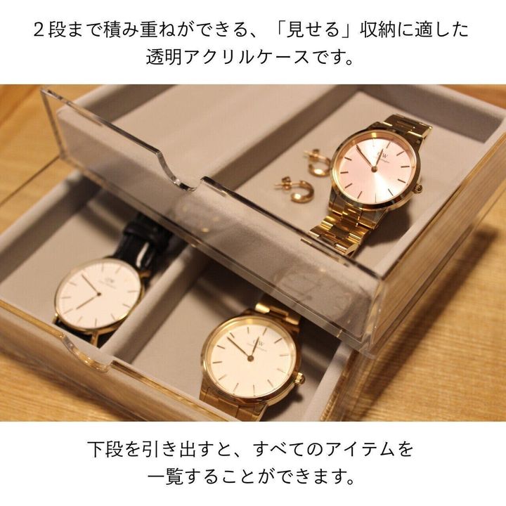 こちらは大切な腕時計とアクセサリーをシンプルにおしゃれに見せて収納するのに利用しています。透明なアクリル製の2段引き出しタイプになっています。