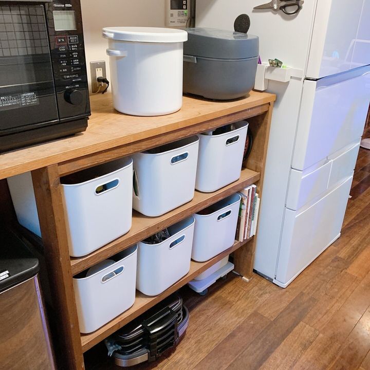 キッチンの背面収納の棚には、やわらかポリエチレンケース・大サイズを使用しています。