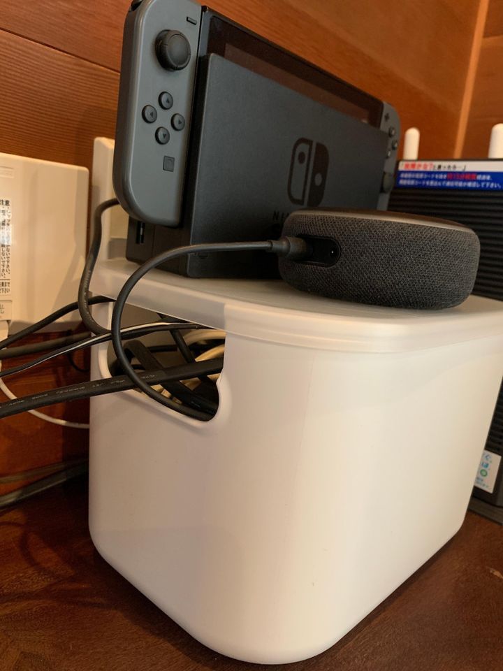 やわらかポリエチレンケース・ハーフ・中サイズを使用しています。取手の部分を切ってしまい、ぐちゃぐちゃのコードを入れやすいようにしました。別売のフタを閉めれば、この上にも収納としてゲーム機などを置く事ができます。