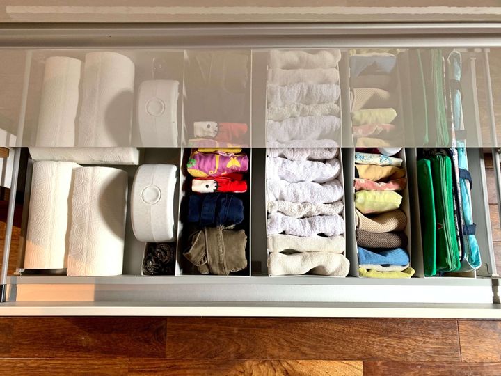 キッチンのシンク下の引き出しに、キッチンで使う布類や紙類、保冷バッグなどを収納しています。