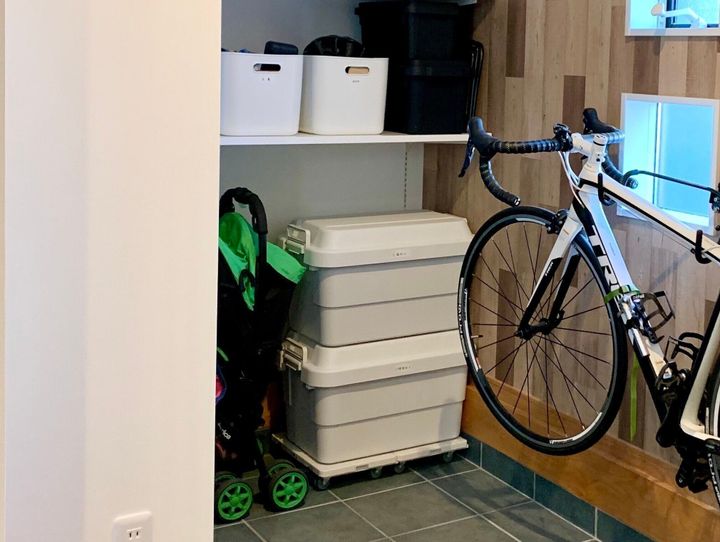 自転車グッズ、外遊びグッズ、頻度の低い工具と分けてボックスに収納しています。