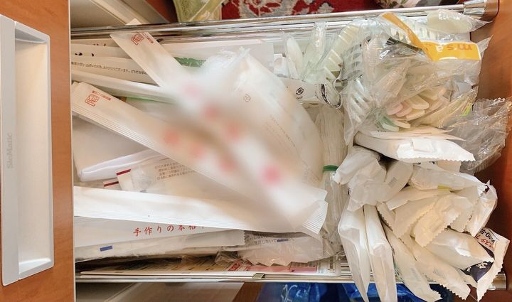 いつか使うと思ってとってある、使い捨ての割り箸やウェットティッシュ