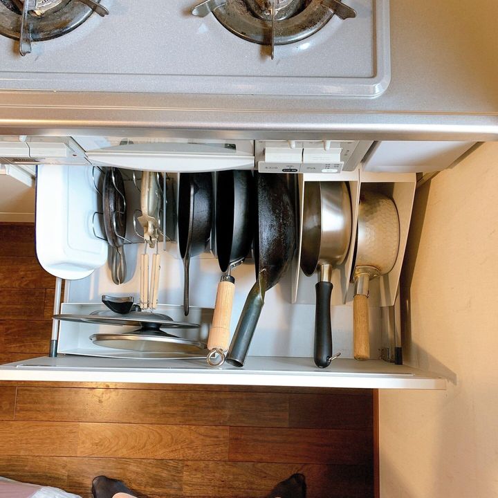キッチンのフライパンや鍋なども、積み重ねて収納してしまうと、下の物が埋もれてしまって、存在を忘れ去られてしまいます。