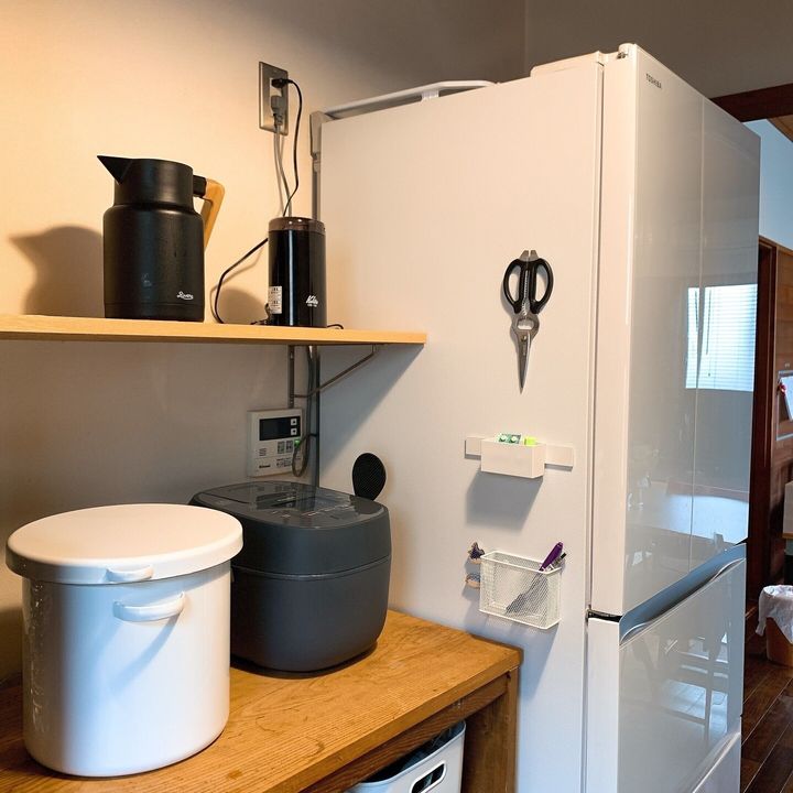 キッチンバサミに強力マグネットをつけて冷蔵庫の脇に貼り付けています。