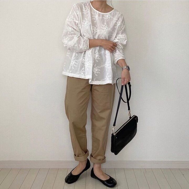 花柄やフリルトップスなどの可愛らしいアイテムはデニムを合わせてカジュアルに着るのも可愛いですが、シェフパンツを合わせるとワンランク上のお洒落な雰囲気に…