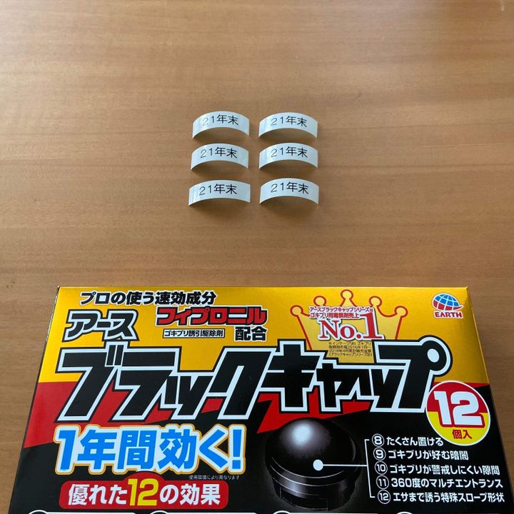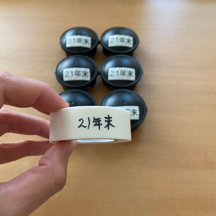 ブラックキャップは12個入りなので、残りの6個も同じようにテプラを貼り、実家に設置しています。管理してくれるので親も助かるようですが、残り半分を1年間も収納しなくて済むので私も助かってます。