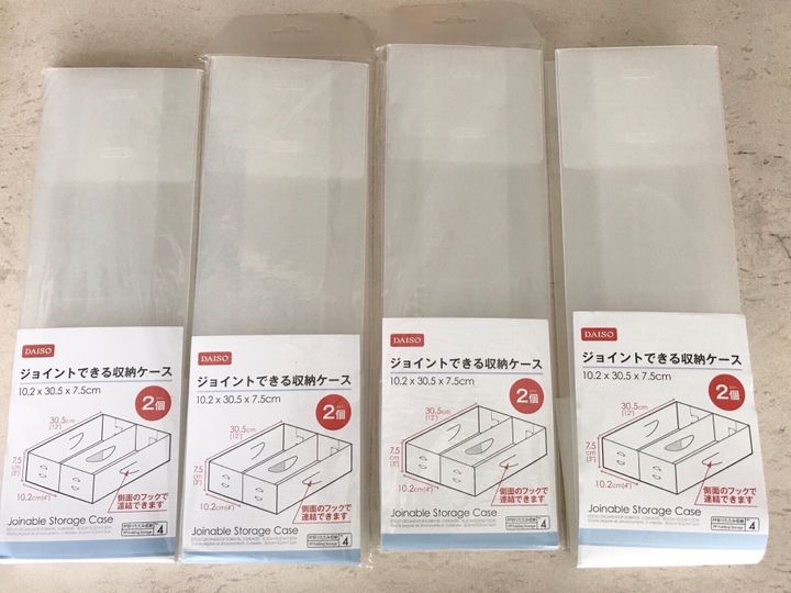 ダイソーの「ジョイントできる収納ケース」です。無駄なスペースが全く出来ないので、とても使いやすく、限りなくシンプルな見た目もおすすめポイントです。2個入りなのも嬉しいところです。