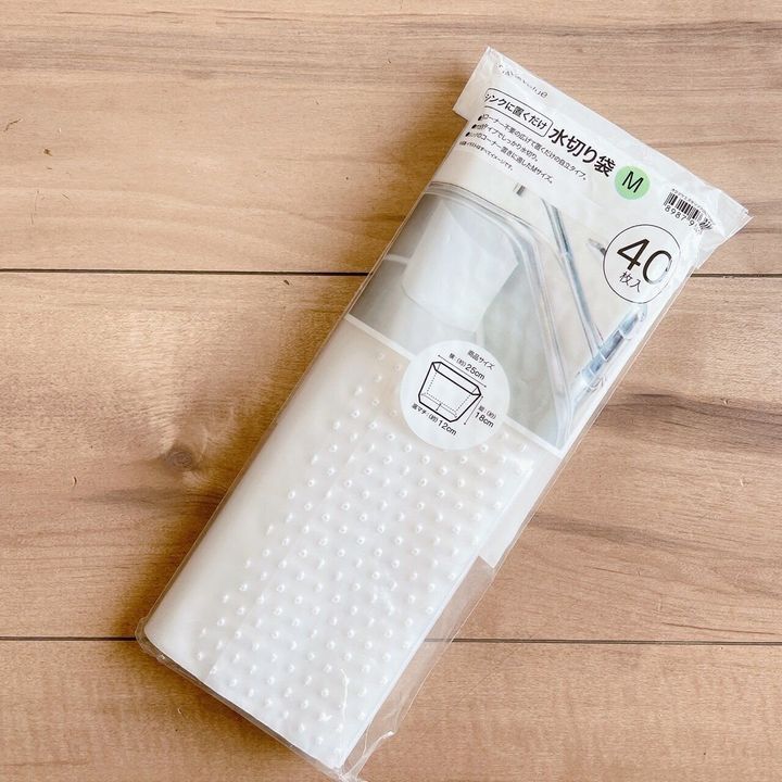 皆さんは、生ごみの処理どうしていますか?「シンクに置くだけ水切袋(40枚入り)」(税込199円)は穴あきタイプの袋なので、生ごみの処理がラク!以前は生ごみはビニール袋に入れて、水分が多い時はハサミやつまようじで穴をあけて水切りしていたので、その手間が省けて時短にもつながりました。