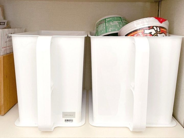 わが家は吊戸棚はないのですが、キッチン横の収納棚で大活躍!お菓子とカップ麺を入れています。お値段もお手頃で「お値段以上ニトリ!」ですね。買って損なしの収納グッズです。