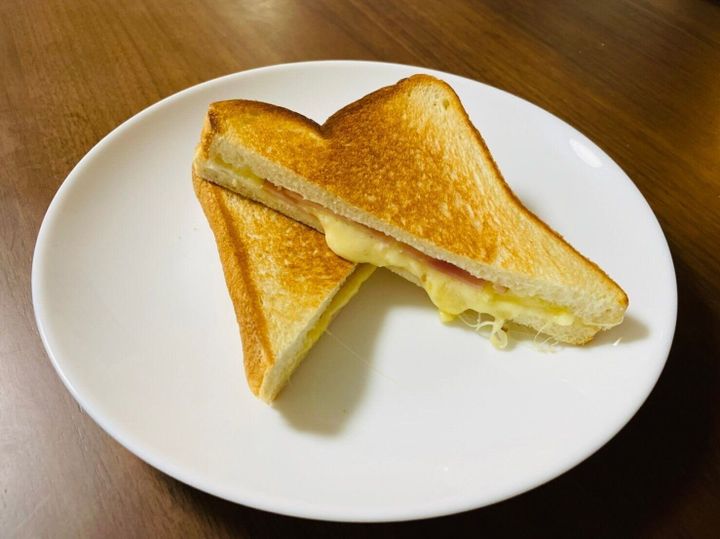 いつもの食パンに好きな具材をギュッとはさんで焼くだけ。ガスコンロ(弱火)で片面1~2分ずつ焼くと、あっという間にホットサンドの出来上がりです。8枚切りの食パンで作りました。