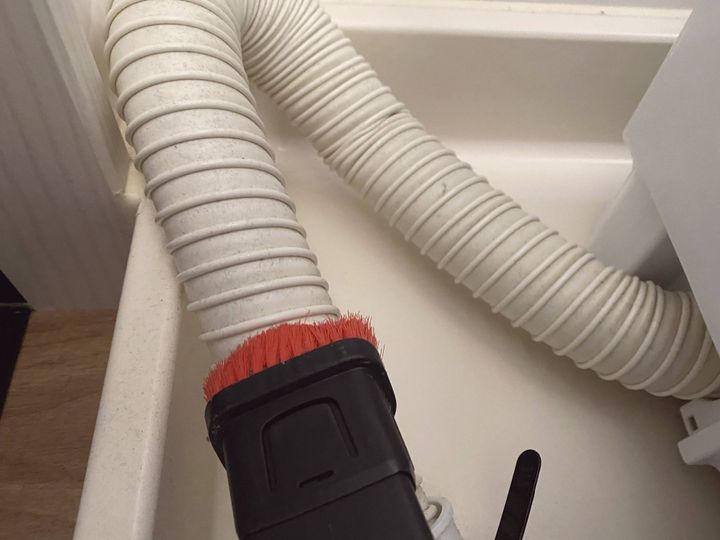 床の掃除機をかけるついでに、掃除機の先端をノズルブラシに付け替えて排水ホース表面のホコリを吸い取ります。