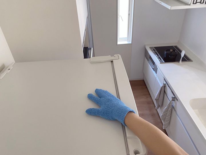 おそうじ手袋で簡単に拭き取ったほうが効率がいいことに気がついたので、そうじのついでに冷蔵庫の上などを拭くようにしました。