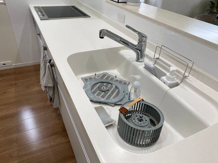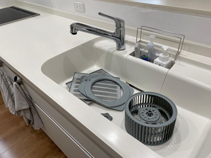 先ほど外したパーツは丸洗いできるので、シンクに置き、台所用洗剤を使って油汚れを落としていきます。