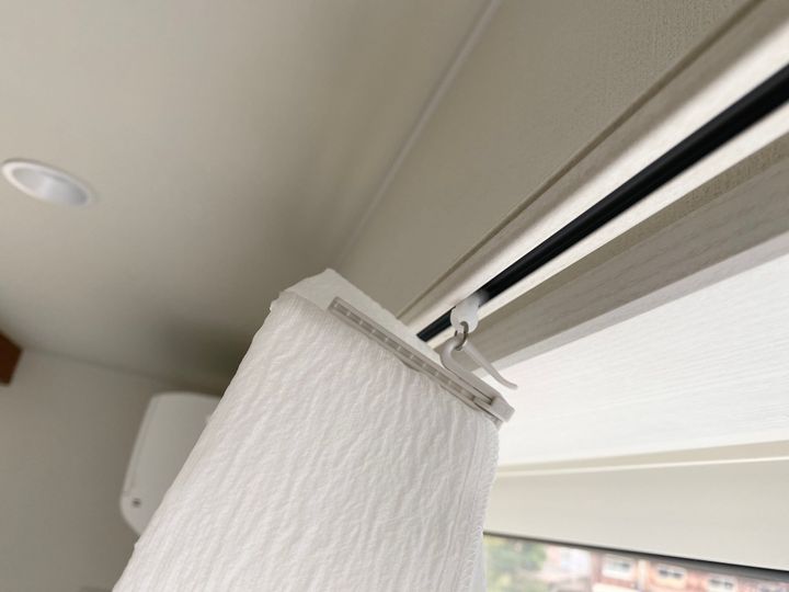 カーテンレールが丸見えな状態よりも、レールが隠れるようにフックを調節して取り付けると、少し垢抜けた雰囲気になりますよ。