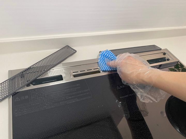 ウエス(引っかかりにくいクロスなど)にセスキ炭酸ソーダを染み込ませ、排気口の汚れも拭き取ります。