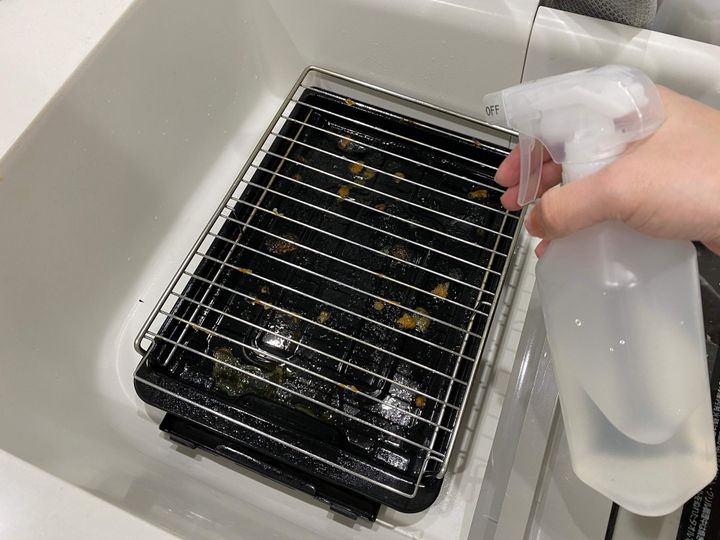 魚焼きグリルをシンクに持ってきたら、汚れが乾いてしまう前にセスキ炭酸ソーダスプレーをかけておきます。