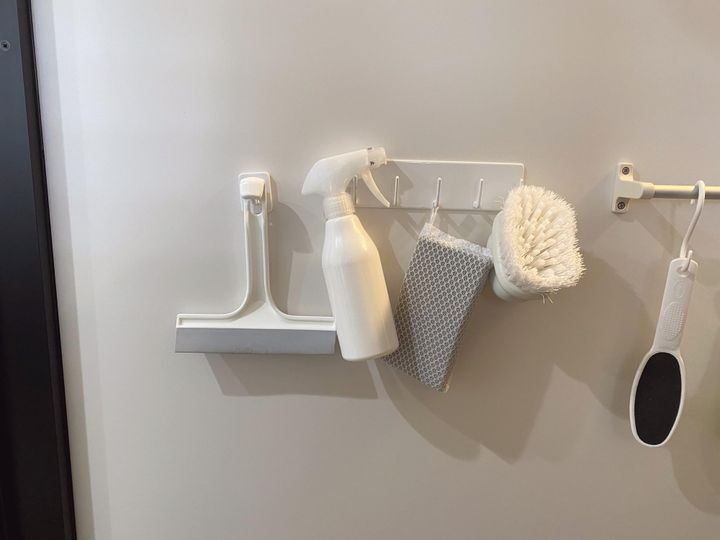 我が家も壁面収納をしており、とくにお風呂場はヌメリやカビが発生しないよう水はけをよくするためにも全て壁から吊り下げています。