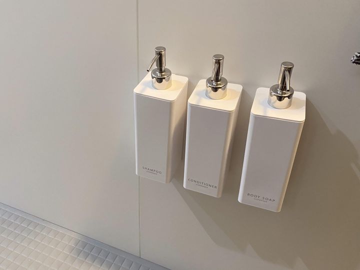 シャンプー・コンディショナー・ボディソープをマグネット付きのディスペンサーに詰め替えて使用しているのですが、壁に付けたままプッシュをすると下に落ちてしまうこともあり危険です。