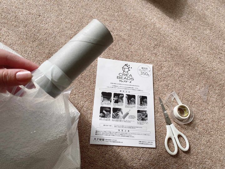 補充用ビーズの袋の角をハサミで斜めにカットし、トイレットペーパーの芯を入れてテープで固定します。