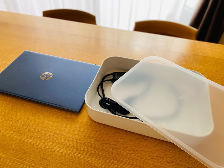 まずノートパソコンのコード収納。ノートパソコンのサイズに合わせてケースとフタを選べば、パソコンを載せられるため省スペースかつスッキリと片付いた印象に。