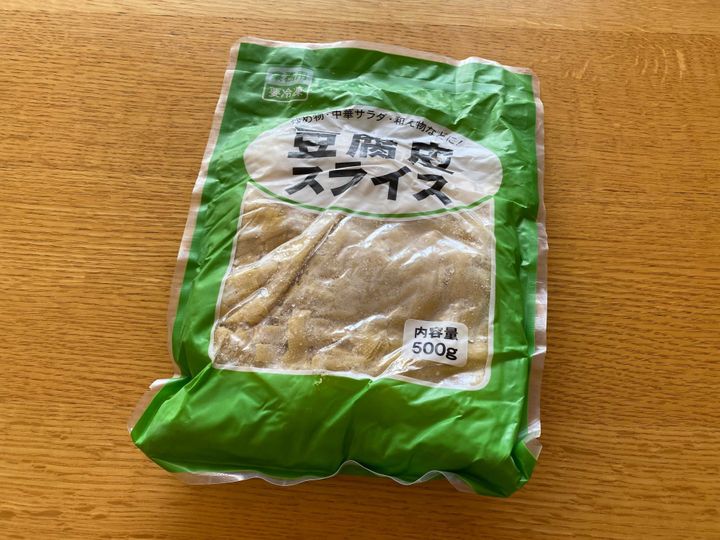 豆腐を圧縮して作られています。固めの木綿豆腐の表面をイメージしてください。豆腐の香りは強く、麺に近い見た目ですが食感は似ておらず、高野豆腐と湯葉の中間のような食感です。