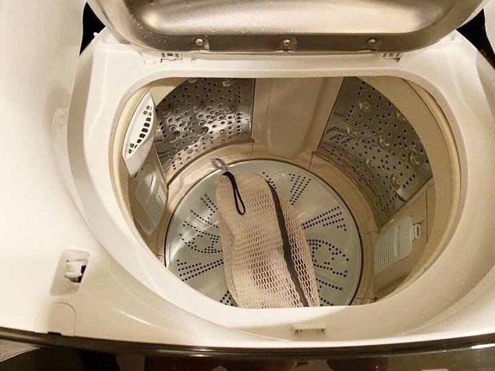 一見ふつうの洗濯ネットですが、内側が特殊繊維のブラシになっているのです。撫でるとちょっと痛いくらいの硬めのブラシが付いているおかげで、洗剤と一緒に洗濯機に放りこむだけで上履き洗い完了。脱水まで済んでしまうので、洗い場から干し場まで運ぶ間に水滴が落ちてイライラするなんてことも起こりません。