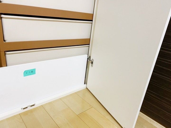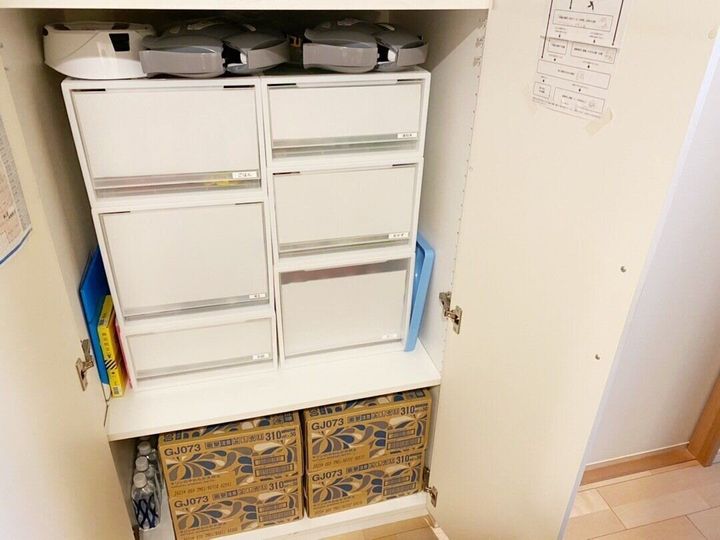 そして防災備蓄庫にしている廊下収納は棚板を2枚外し、かわりに引き出しを入れることで収納力を上げつつ出し入れしやすくなりました。