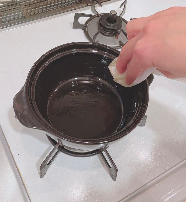 1:土鍋の内側全体にごま油を塗っておきます。焦付き防止になります。