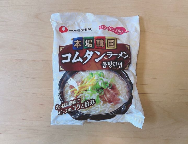 こちらが『コムタンラーメン』完成形です!白濁のスープは牛の脂が溶け込んでコクがありますが、塩味なのでしつこくありません。具材(かやく)にはたっぷりのネギが入っています。そしてコラーゲンペプチドが500mgも入っているのも嬉しいですね。
