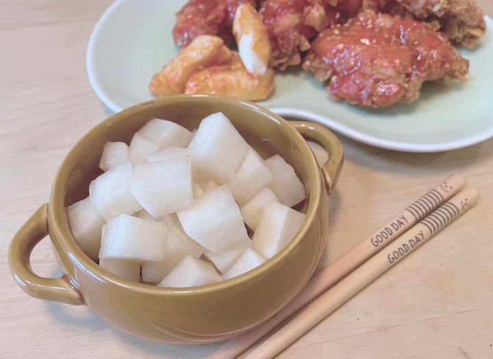 いつもチキンの隣にいる白く四角い物体は「大根」の漬物です。韓国語では大根を「무(ム)」と言うので、この白い物体もそのまま「ム」と呼ばれたり、チキンと一緒に食べる大根ということで「チキンム」などと呼ばれています。