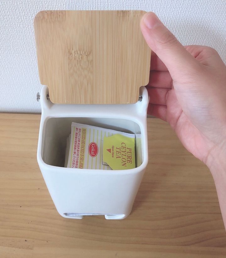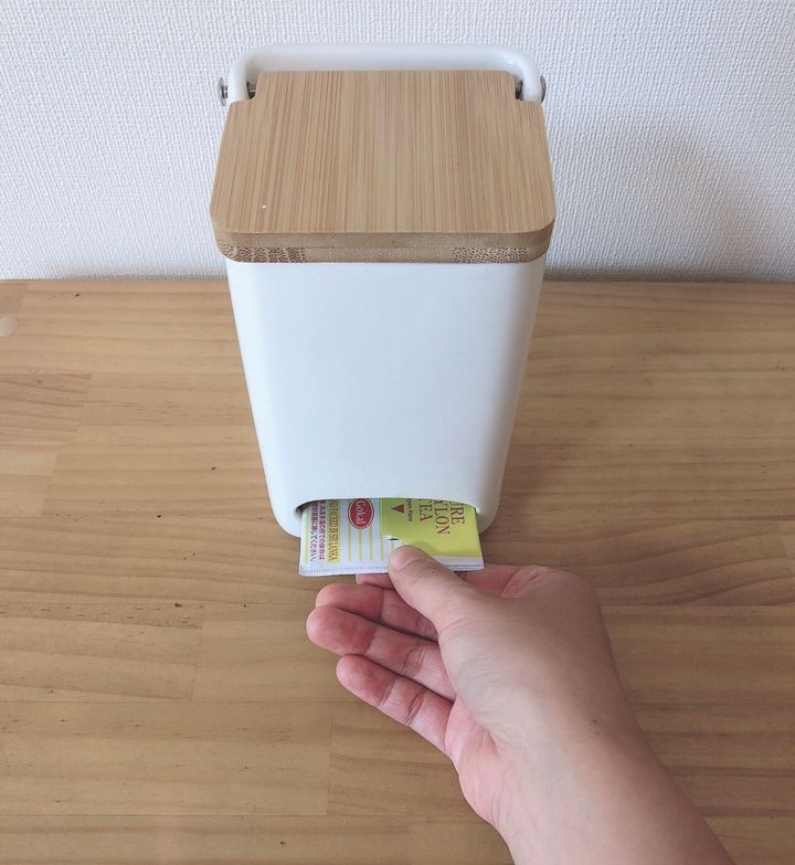 下のほうに口が開いていて、そこからティーバッグを1つずつ取り出せます。