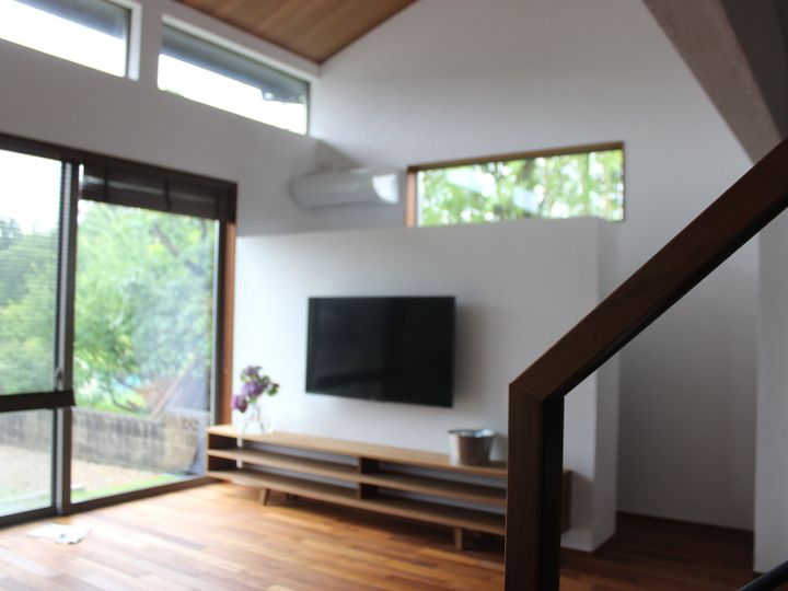 収納の裏は窓側に45センチ、テレビ側に30センチの可動棚を設けました。
