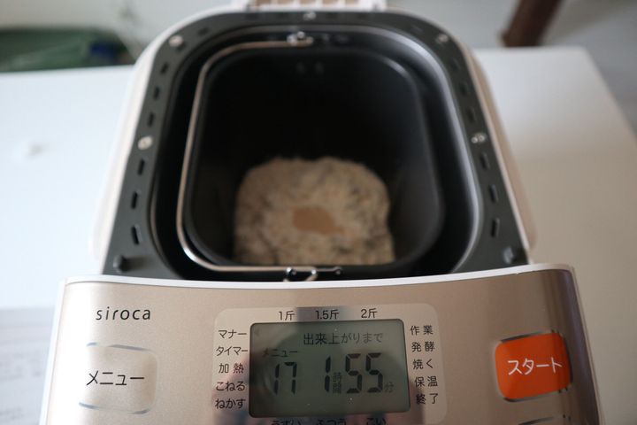ホームベーカリーには様々な機能がついていて、その中に「パン生地」のメニューもあるのでそちらを選択してスタートを押すだけで生地がほぼ完成します。