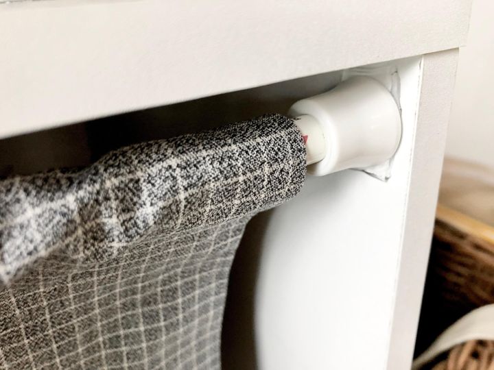 4.突っ張り棒とは反対の裾の部分は生地をカットした際にほつれているはずです。このほつれを隠すために、最初に時点で少し大きめのサイズでカットしました。突っ張り棒を取り付けた際に、裾が引きずらない程度に折って「裁ほう上手スティック」を塗って留めます。