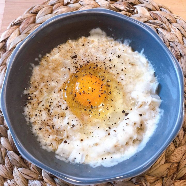 豆乳とコンソメ、チーズを入れて電子レンジで加熱し、卵をトッピングすると豆乳リゾットになります。