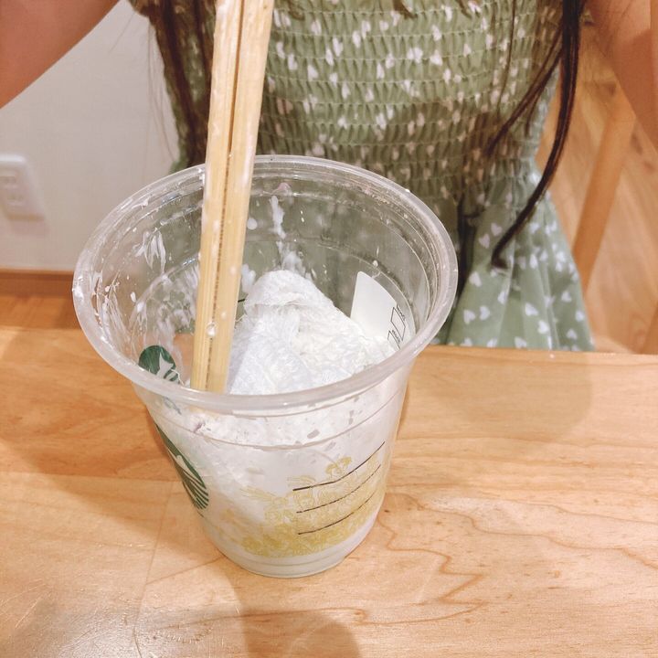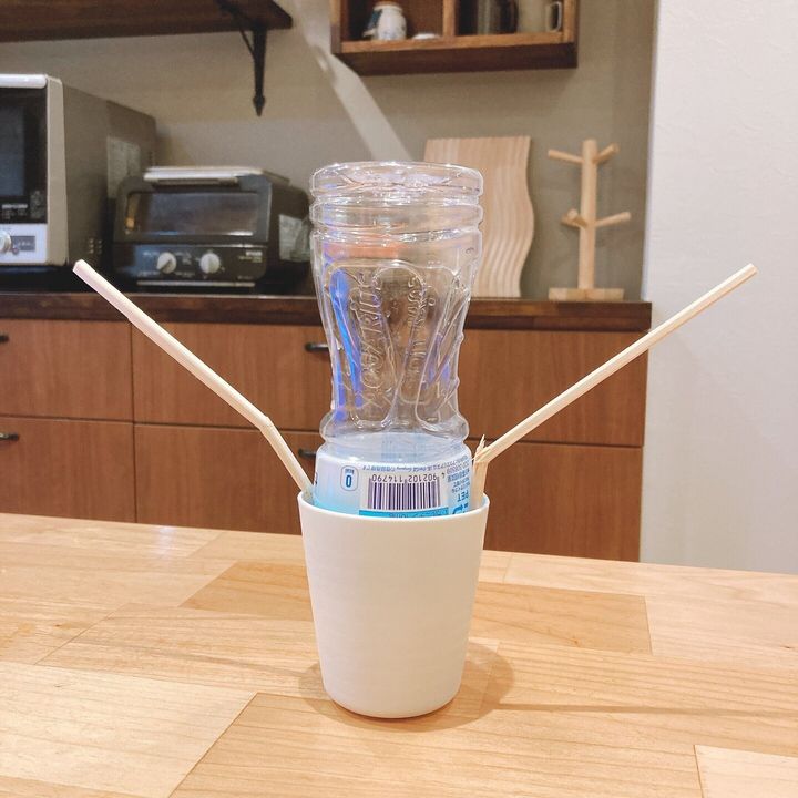 作りたい形の土台を作るのですが、私はコップの上にペットボトルを逆さまに入れ、コップの両端に割った割り箸を挟んで土台を作りました。