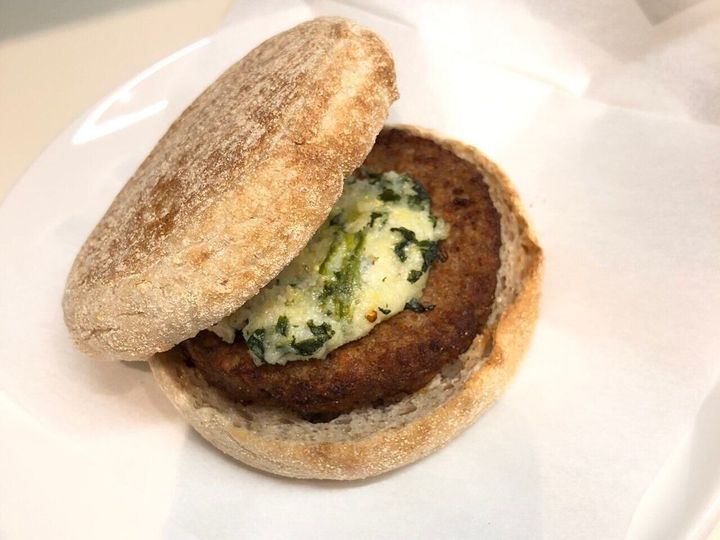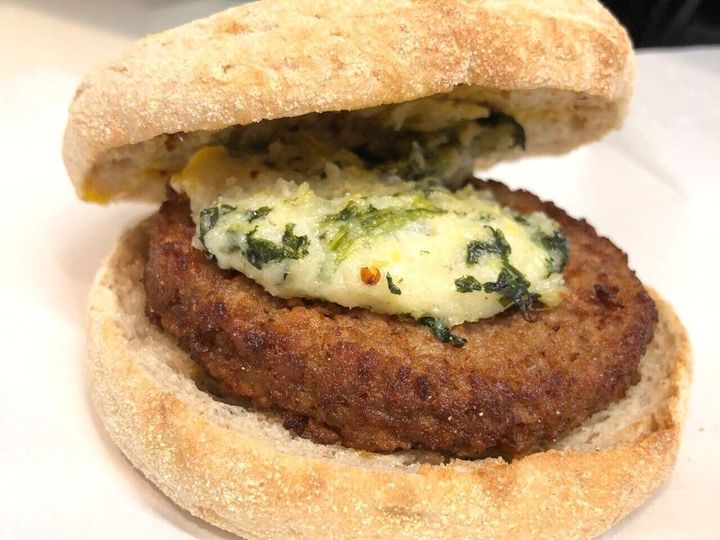 パンにはマスタードソースが塗られていて、ほうれん草入りの豆乳フィリングがソイハンバーグをしっとり、包み込んでくれています。