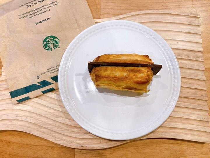何層にも重なっているデニッシュ生地に、板チョコが挟まっている、見た目にもインパクト大のチョコレートデニッシュです。