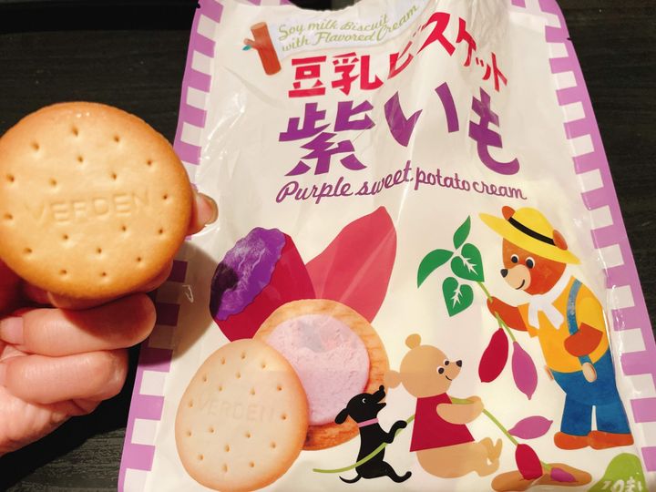 豆乳ビスケットの優しい味と、薄い紫色の優しい甘さの紫いもクリームがよく合っていて、つい次の袋に手がいってしまいます。