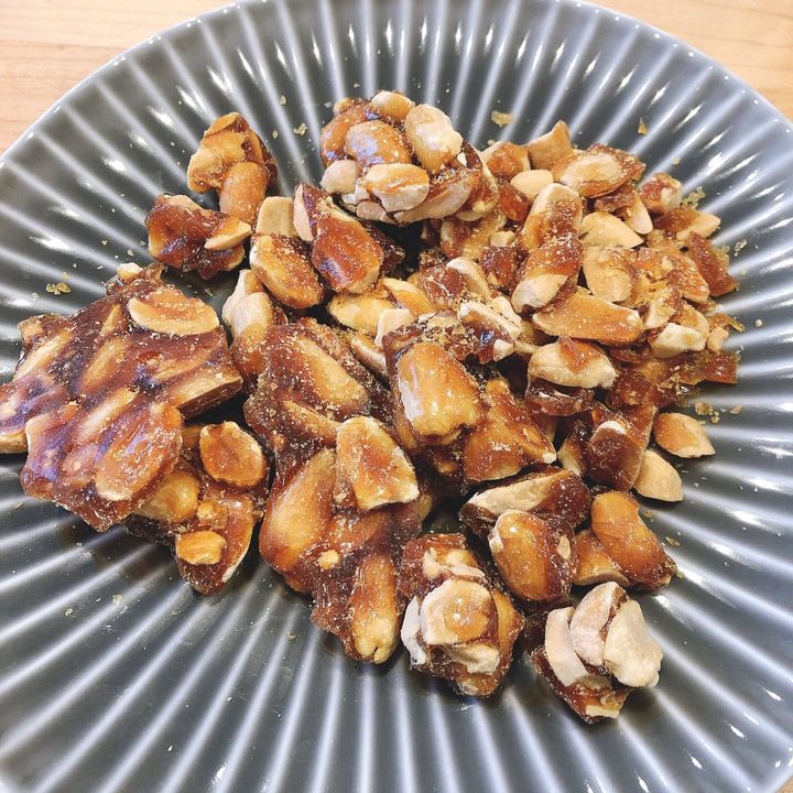 黒糖がコーティングされたピーナッツの塊が大小入っています。