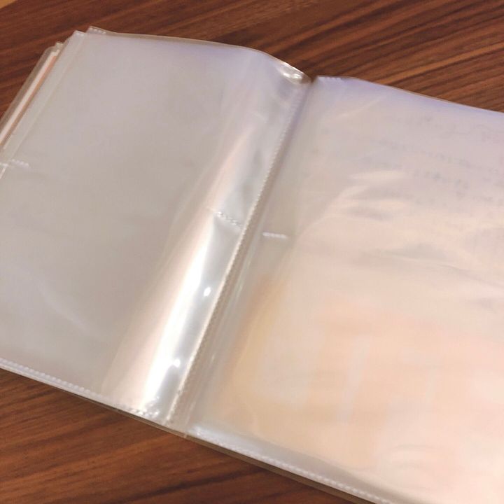 写真付き、メッセージ付きの年賀状は無印良品のハガキホルダー264ポケット付き690円(税込)に収納します。