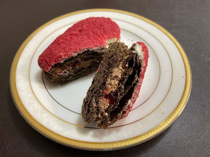 ココア風味のデニッシュ生地に、ガナッシュホイップと、ジャムのようなジュレのようなフランボワーズフィリングが入っています。
