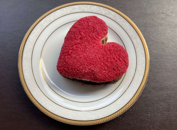 真っ赤なハートの中身は、固めのホワイトチョコレートで、フランボワーズ風味のガナッシュがコーティングされています。