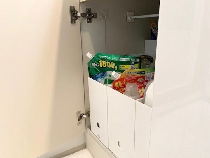 繰り返し使えそうなので、洗面所下にフックを付けて吊るしておくことにしました。