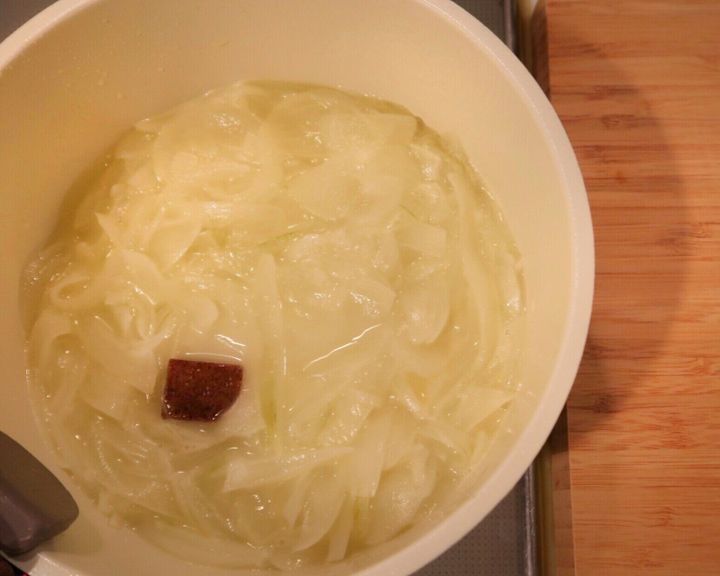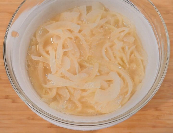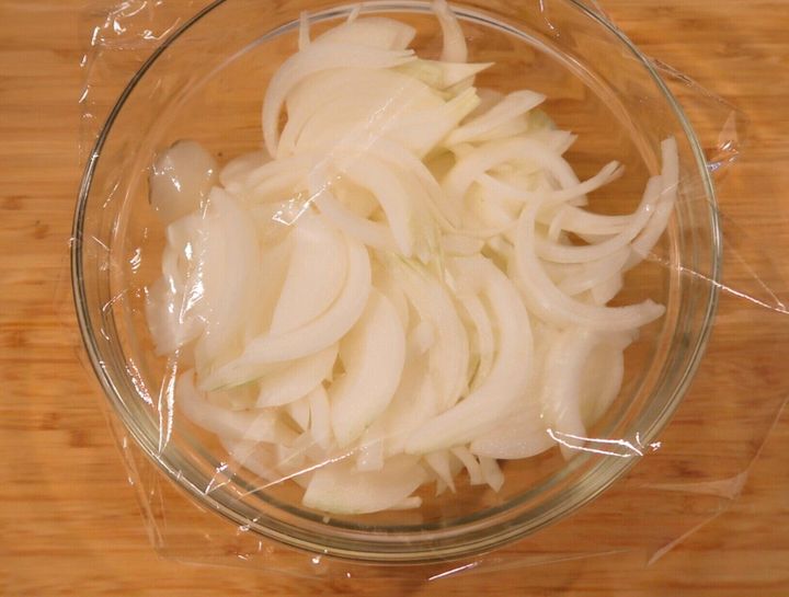 カットした玉ねぎを耐熱ボウルに入れ、600Wの電子レンジで約5分加熱します。(ボウルが熱くなるのでやけどにご注意ください。)