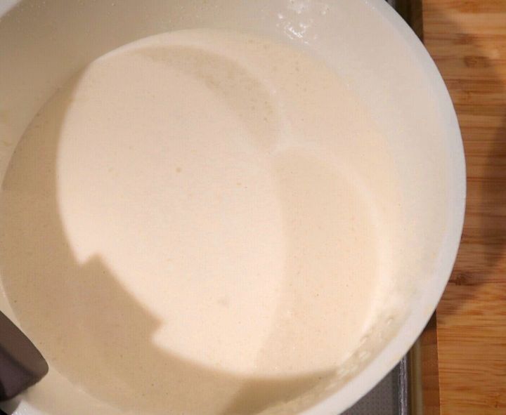 ボウルに移し氷水にあて粗熱をとり、ミキサーにかけます。ミキサーがまわりにくい場合は少量の牛乳を加えます。