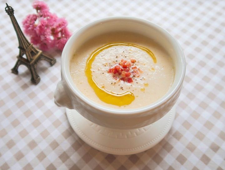 みじん切りにしたベーコンを油をしいたフライパンでカリカリに焼けば、ポタージュと相性抜群のトッピングのできあがりです!ちょっと多めにつくり、サラダのトッピングとしてもおいしくいただくことができます。お好みでオリーブオイルやペッパーをかけるとさらにリッチな味わいに!