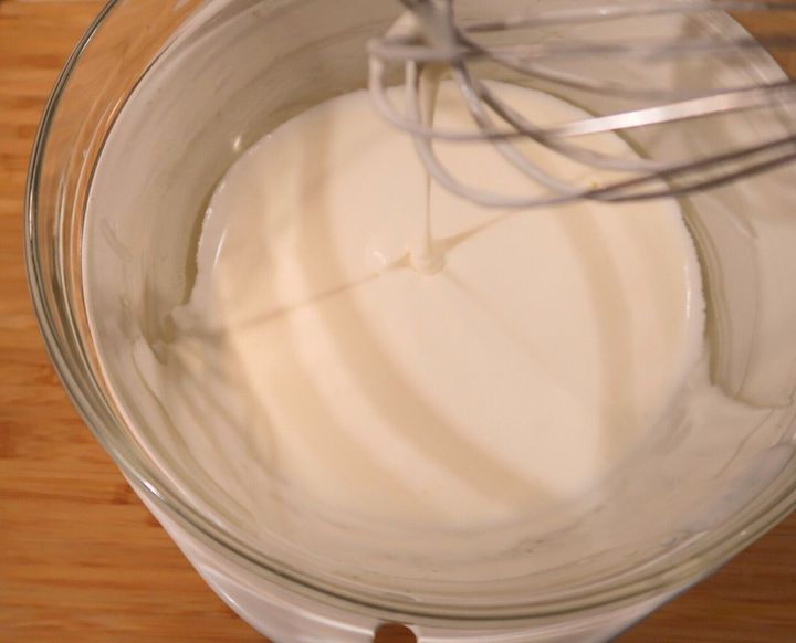 泡立て器を持ちあげると角が立ち、先端がかるくおじぎをするくらいの固さ(8分立て)になればチョコクリームの完成です!