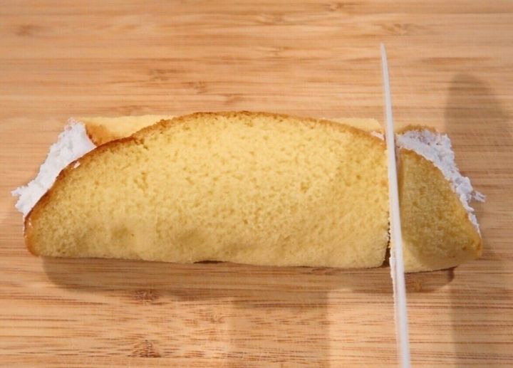「まるごとバナナ」をスポンジが重なっている部分を上向きにし、右端から約3cmのところでカットします。